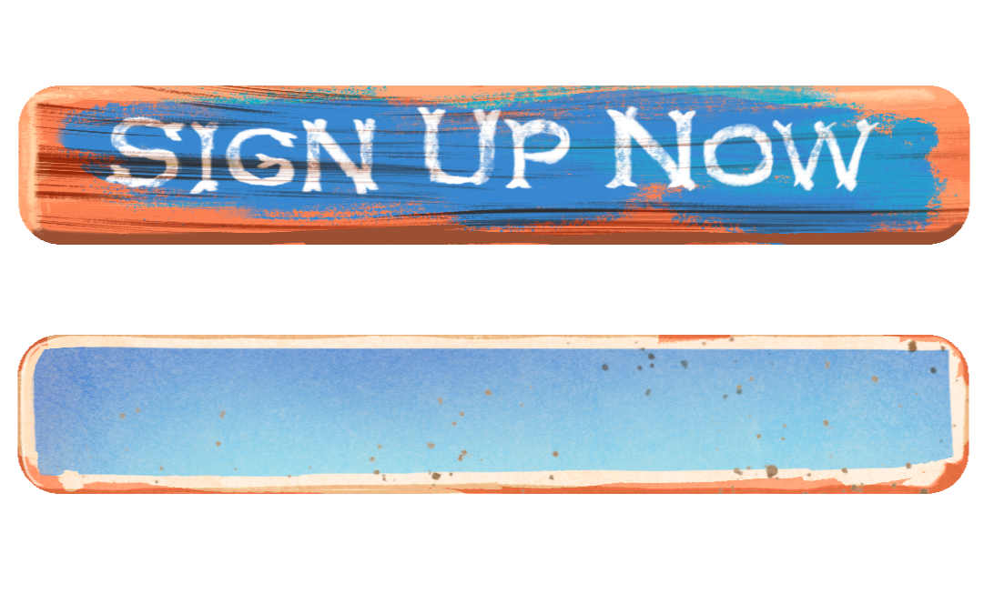 I experimented with potential CTA buttons, illustrating materials and lettering that would look natural in Pixar’s world of Porto Rosa: a 60’s Italian seaside, small businesses, dreamy, worn-in. I create an eroded metal sign like Alberto’s Vespa poster, wood signage and lettering as was seen in different village shops, and warped wood planks like those in the fishing wharf.